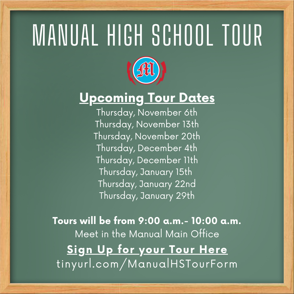 Manual will host Tours The tour will be hosted by Principal Chris DeRemer and members of student government. Tours will last from 9:00 – 10:00 and will consist of a tour, a chance to hear from the principal and students about programming and a time for prospective parents and families to ask questions about Manual. If Fridays do not work for you, please email Principal DeRemer at christopher_deremer@dpsk12.net to schedule a tour that works for you and your prospective students. Click here to sign up.